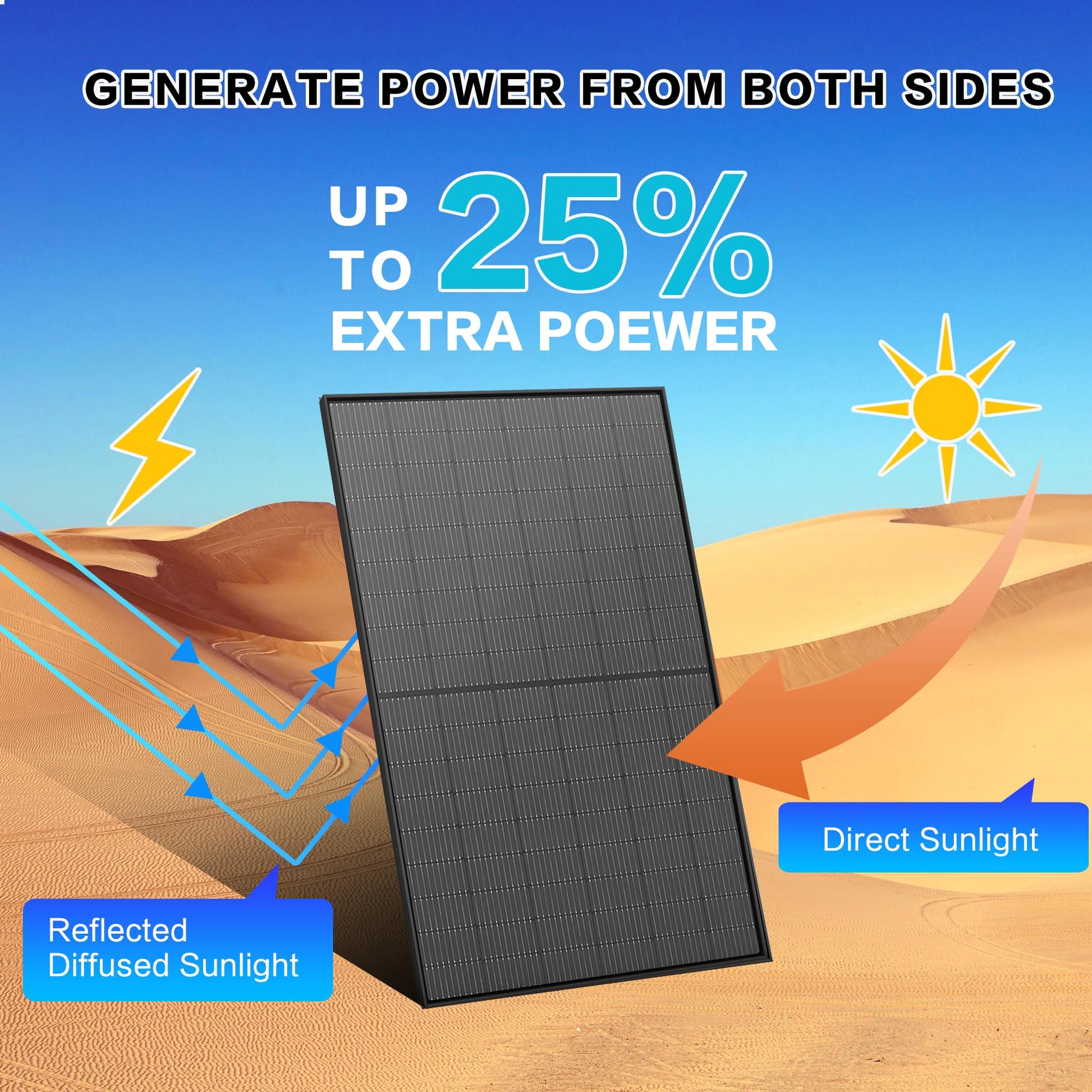 A: Bifacial solar panels have a unique double-sided design that absorbs sunlight from both the front and the back and converts it into electricity, which increases the power generation efficiency by at least 5% compared to traditional single-sided solar panels. This means that under the same conditions, bifacial solar panels can generate more electricity.
